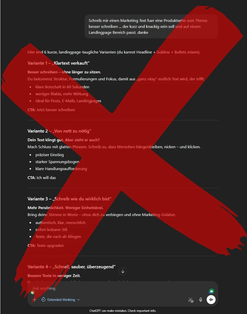 Das Alte Ich: Deine Texte klingen "nett", aber austauschbar. Wie ein gut geschriebener Wikipedia-Artikel. Beige. Glatt. Ignorierbar.