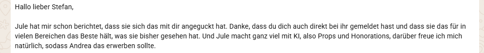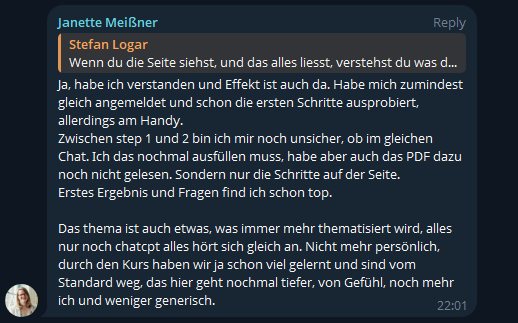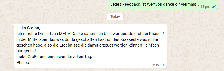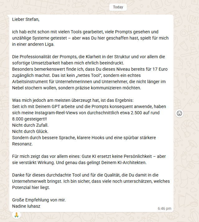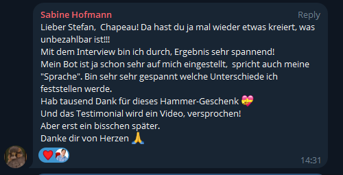 „Chapeau, Stefan! Du hast da wirklich etwas Unbezahlbares geschaffen. Nach dem Interview spricht mein Bot schon meine eigene Sprache – das fühlt sich krass richtig an. Tausend Dank für dieses Hammer-Geschenk! ♥️ Video kommt – versprochen!“